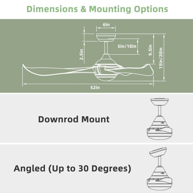 3-in-1 multi-function design for being used as a fan; a light and a beautiful decor6 wind speeds and a 1-8H timer function meet your different needs3 reversible blades provide upward or downward airflow in different seasonsEquipped with a high-quality DC motor; ensuring powerful airflow with low noiseRemote control for convenient operation without leaving where you are2 mounting ways for flat ceilings or ceilings with a tilt angle of less than 30 degreesSuitable for living room; bedroom; dining room; etc.Easy to assemble with the help of the detailed user's manual